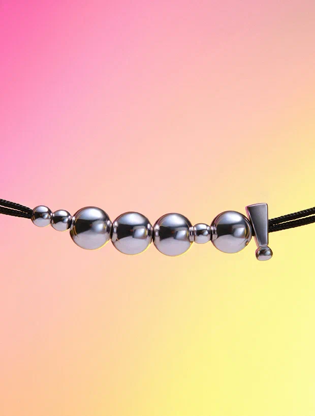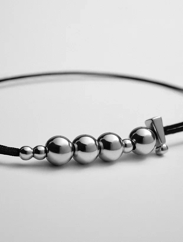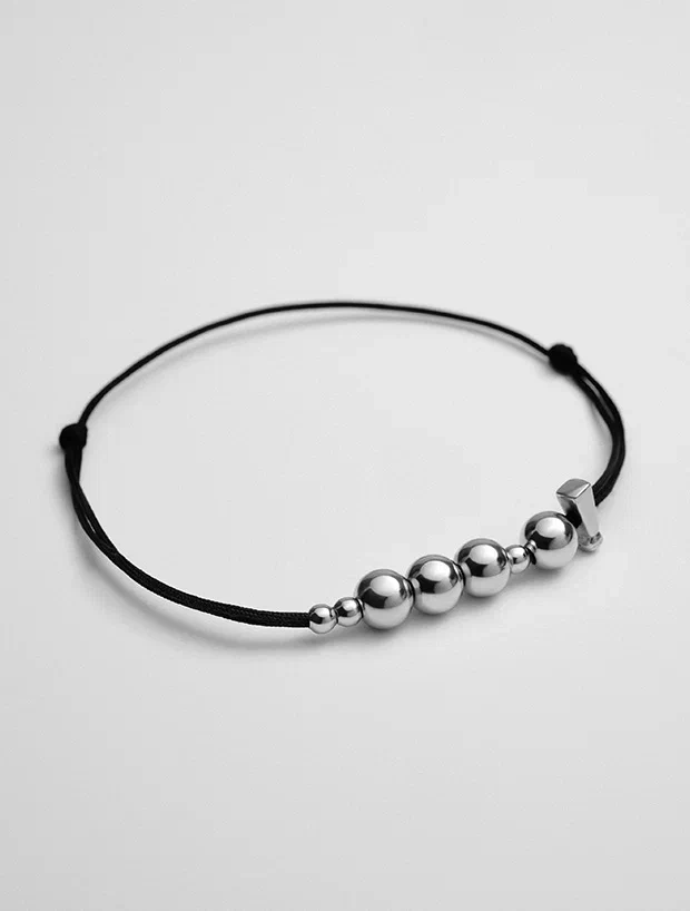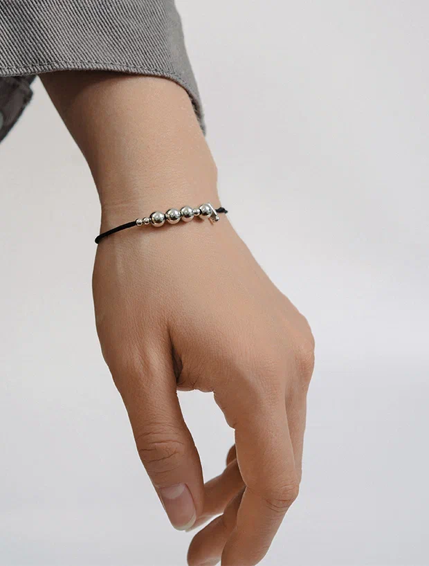 Изящный браслет выполненный из нитки и посеребренного логотипа Субботы! в виде шариков.